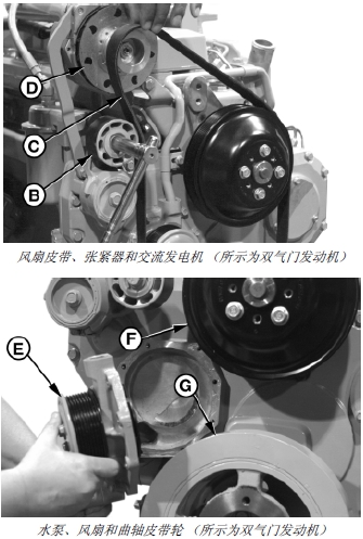 6. 對(duì)于四氣門John Deere約翰迪爾強(qiáng)鹿柴油發(fā)動(dòng)機(jī): 如果需要,整體拆下風(fēng)扇皮帶張緊器和支架。