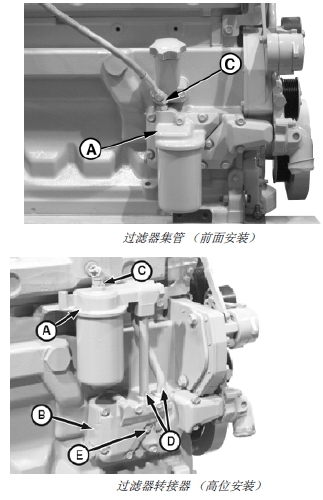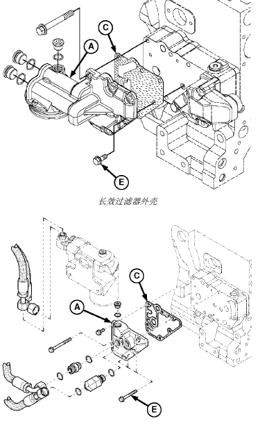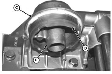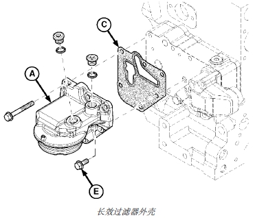 對于配備長效過濾器的John Deere約翰迪爾強(qiáng)鹿柴油發(fā)動機(jī):在內(nèi) (B) 外 (A) 密封和過濾器螺紋上涂一層干凈的機(jī)油。用干凈的布子擦拭集管的兩個密封面(D 和 E)。確保防塵密封 (C)位于集管的正確位置上,并且密封翼片要與蓋槽對齊。如果損壞,更換密封。安裝機(jī)油過濾器并用手?jǐn)Q緊,直到貼緊防塵密封墊。密封墊接觸后不得像安裝其他過濾器一樣再擰緊 1/2 - 3/4 圈。