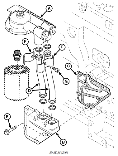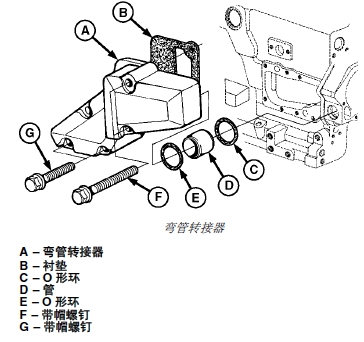 注意: 舊式John Deere約翰迪爾強(qiáng)鹿柴油發(fā)動機(jī)的油管 (D) 是彎管轉(zhuǎn)接器 (A) 的一部分,且不使用 O 形環(huán) (E)。確保 O 形環(huán) (C) 正確安裝在正時齒輪蓋冷卻液端口的槽中。