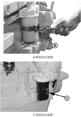 3. 使用合適的過濾器扳手拆卸機(jī)油過濾器(B 或 C)。