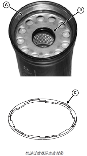 重要提示: 不得使用過濾器扳手安裝過濾器。只能用手安裝過濾器。對于裝配長效過濾器的John Deere約翰迪爾強(qiáng)鹿柴油發(fā)動機(jī),確保防塵密封的翼片 (C) 正確安裝在殼體槽中,然后安裝過濾器。