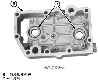 5. 拆下 O 形環(huán) (C),檢查 O 形環(huán)安裝槽的表面光潔度。如果用指甲可以感觸到有劃痕,應(yīng)更換機(jī)油冷卻器的外殼。外,如果密封槽中有大于 0.5 毫米(0.20英寸)的砂眼,也應(yīng)更換外殼。