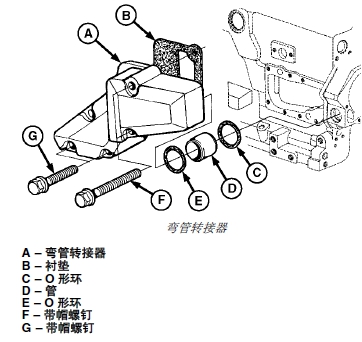 10. 安裝襯墊 (B)、O 形環(huán)(C 和 E)、油管 (D) 和彎管轉(zhuǎn)接器 (A)。用帶帽螺釘(F 和 G)將彎管轉(zhuǎn)接器固定在John Deere約翰迪爾強(qiáng)鹿柴油發(fā)動機(jī)上。按規(guī)格要求擰緊帶帽螺釘。