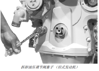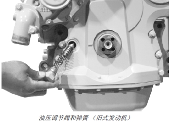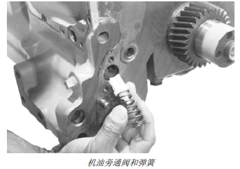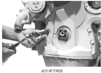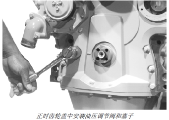 7. 將油壓調(diào)節(jié)閥、彈簧、墊圈和塞子裝入正時齒輪蓋。按技術(shù)規(guī)格要求擰緊塞子。