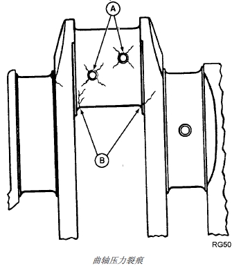 7. 仔細檢查曲軸在連桿軸頸油孔和軸頸圓角處 (B) 是否有裂痕。如果發(fā)現(xiàn)裂紋,需更換曲軸。