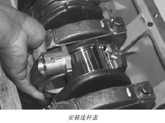 10. 用新帶帽螺釘安裝帶軸瓦的連桿蓋。(有關(guān)安裝和擰緊連桿帶帽螺釘?shù)男畔?,請參見?030 章的“安裝活塞和連桿”部分。)