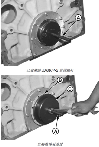 3. 將 JDG975 正時齒輪室蓋/ 后油封箱定位器 (C) 較大的一端安裝曲軸后凸緣上,錐形定位器 (D) 應(yīng)位于時鐘 3 點(diǎn)和 9 點(diǎn)的位置。