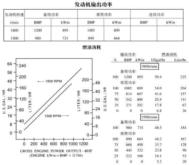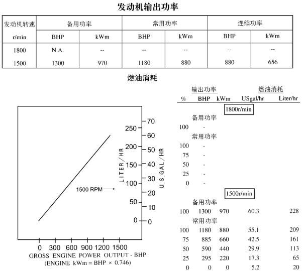以上所示發(fā)動機性能數(shù)據(jù),是基于ISO 3046 標準規(guī)定的條件—海拔110m(361ft),大氣壓力100kPa (29.53inHg),進氣溫度25°C(77°F),相對濕度30%,使用NO.2柴油或相當于ASTM D2柴油的條件下得到的。 功率標定使用準則見《G-發(fā)動機功率標定使用準則》。 油消耗數(shù)據(jù)是基于重度為0.85kg/l(7.1lbs/U.S.gal.)的NO.2柴油而得到的。 | |