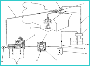 1. 高壓油泵進(jìn)油管 2. 減振器 3. 回油節(jié)流孔 4. 高壓油泵 5. 回油管 6. 噴油嘴 7. 連接塊 8. 手動(dòng)注油泵 9. 注油旁通閥 10. 燃油箱 11. 進(jìn)油管 12. 燃油粗濾器(CWR 沒(méi)有) 13. 燃油壓力表 14. 燃油細(xì)濾器 15. 溢流閥 16. 燃油輸送泵