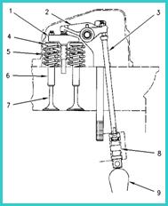 1. 氣門(mén)過(guò)橋 2. 搖臂 3. 推桿 4. 氣門(mén)彈簧旋轉(zhuǎn)壓盤(pán) 5. 氣門(mén)彈簧 6. 氣門(mén)導(dǎo)管 7. 氣門(mén) 8. 氣門(mén)挺柱 9. 凸輪軸