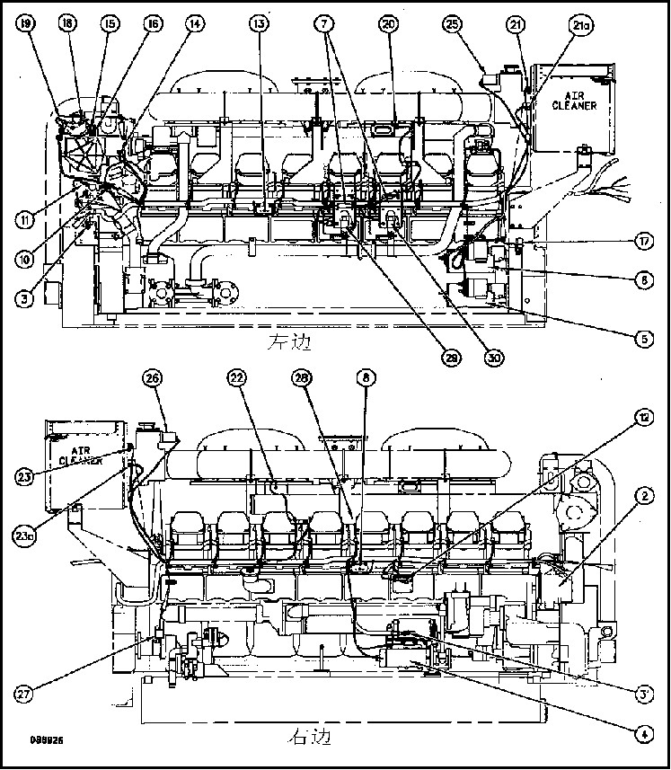 2.充電機(jī) 3.發(fā)動(dòng)機(jī)電控器,4.預(yù)潤滑馬達(dá), 5.起動(dòng)馬達(dá),6.起動(dòng)馬達(dá) 7.電阻器,8.充電機(jī)斷路器.10.后冷卻器溫度傳感器.11.大氣壓力傳感器.12.曲軸箱壓力傳感器.13.發(fā)動(dòng)機(jī)電控器(ECM)斷路器.14.發(fā)動(dòng)機(jī)冷卻液溫度傳感器.15. 已過濾機(jī)油壓力傳感器.16. 未過濾機(jī)油壓力傳感器.17.發(fā)動(dòng)機(jī)正時(shí)\轉(zhuǎn)速傳感器.18.燃油濾清器壓力傳感器(已過濾).19.燃油濾清器壓力傳感器(未過濾).20.左排氣溫度傳感器.21.左渦輪增壓進(jìn)氣壓力傳感器.22.右排氣溫度傳感器.23.右渦輪增壓進(jìn)氣壓力傳感器.24.渦輪增壓氣輸入壓力傳感器.25.空氣關(guān)斷電磁閥(左,選配件).26.空氣關(guān)斷電磁閥(右,選配件).28.噴油器電磁閥 29.輔助起動(dòng)電磁閥.30.輔助起動(dòng)電磁閥.31.預(yù)潤滑壓力開關(guān)(選配件).