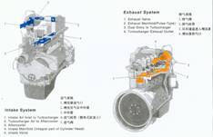 ①系統(tǒng)組成:進(jìn)氣過渡管、空氣濾清器、增壓器、進(jìn)氣歧管、排氣歧管、排氣管等。