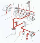 1、機(jī)油泵2、限壓閥3、機(jī)油散熱器4、濾清器旁通閥5、機(jī)油濾清器6、增壓器輸油管7、增壓器回油管8、活塞冷卻噴嘴9、機(jī)油泵惰輪