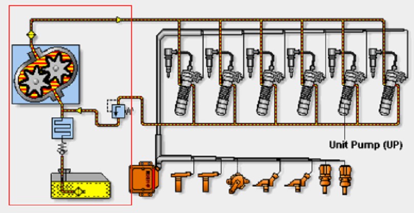 低壓油路組成:油箱、低壓輸油泵、燃油濾清器(粗濾器、細(xì)濾器)、相應(yīng)的油管。