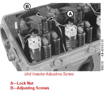7. Tighten adjusting screw an additional 1/2 turn (180) to preload injector. Tighten adjusting screw lock nut to specifications while holding adjusting screw stationary.