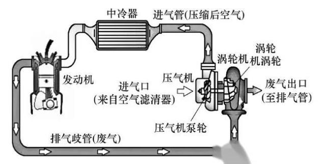 發(fā)動機工作時,排出的廢氣以一定角度高速沖擊渦輪,使增壓器轉(zhuǎn)子高速旋轉(zhuǎn),于是,壓氣機泵輪以同樣的高速擠壓進氣空氣。受壓后的空氣溫度會升高,影響其密度,因此,在壓縮空氣通向進氣歧管的中間通路上增設(shè)了一個空氣冷卻器(簡稱中冷器)以冷卻增壓后的空氣,最終使更多、密度更大的空氣進入氣缸,從而實現(xiàn)進氣增壓的目的。