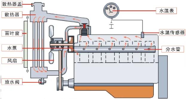 散熱器的進(jìn)水管與缸蓋水套相通,出水管通過水泵與缸體水套相通。發(fā)動(dòng)機(jī)運(yùn)轉(zhuǎn)時(shí),水泵將冷卻液在水套與散熱器之間進(jìn)行循環(huán),把發(fā)動(dòng)機(jī)水套內(nèi)高溫的冷卻液抽入散熱器進(jìn)行散熱,再將散熱后的低溫冷卻液送入水套繼續(xù)對(duì)發(fā)動(dòng)機(jī)進(jìn)行冷卻。