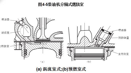 分隔式燃燒室由兩部分組成:一部分位于活塞頂與汽缸蓋底面之間,稱為主燃燒室;另一部分在汽缸蓋中,稱為副燃燒室。兩部分之間有一個或幾個孔道相連。分隔式燃燒室常見的形式有渦流室式和預(yù)燃室式兩種,如圖4-5所示。