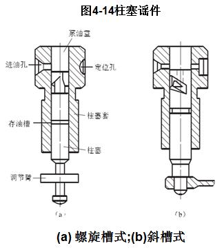 柱塞偶件是產(chǎn)生高壓油的壓油元件,其結(jié)構(gòu)如圖4-14所示。柱塞套裝在泵體座孔內(nèi)固定不動(dòng),柱塞由凸輪驅(qū)動(dòng),在柱塞套內(nèi)上下往復(fù)運(yùn)動(dòng)。此外,可繞自身軸線在一定角度轉(zhuǎn)動(dòng)。柱塞頭部的圓柱表面銑有螺旋槽或斜槽,并利用直槽或中心孔(徑向孔和軸向孔)使槽與柱塞上方泵腔相通。柱塞套上部開有一個(gè)進(jìn)油和回油用的徑向小孔與泵體上的低壓油腔相通,有的則開有兩個(gè)徑向小孔,兩個(gè)小孔的中心線可以在一個(gè)水平線上,也可不在同一水平線上,上面的為進(jìn)油孔,下面的為回油孔。柱塞彈簧通過彈簧座將柱塞推向下方,使柱塞下端與滾輪式挺桿接觸,并使挺桿中的滾輪與下凸輪接觸。