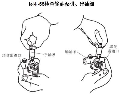 ①檢查進(jìn)、出油閥密封性。如圖4 - 55所示,用左手指按住出油口,用右手上下拉動(dòng)手柄,手指能感覺(jué)到脈動(dòng)壓迫感,當(dāng)放松手柄時(shí),手柄能自動(dòng)彈起,說(shuō)明進(jìn)油閥密封良好;擰下進(jìn)油管接頭,用手指按住進(jìn)油口,上下拉動(dòng)輸油泵手柄,手指能感覺(jué)到脈動(dòng)的吸力,當(dāng)放松手柄時(shí),手柄能自動(dòng)吸回去,說(shuō)明出油閥密封性良好。