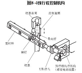 預(yù)行程控制機(jī)構(gòu),如圖5-3所示。控制套筒在導(dǎo)向桿的引導(dǎo)下可上下移動(dòng),而控制套筒的上下移動(dòng)是由預(yù)行程執(zhí)行機(jī)構(gòu)(螺旋電磁線圈)通過(guò)U形接頭轉(zhuǎn)動(dòng)定時(shí)桿,并由其上的銷(xiāo)釘撥動(dòng)控制套筒上下移動(dòng)來(lái)改變預(yù)行程的。