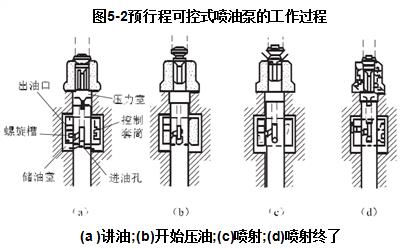 預(yù)行程可控式噴油泵的構(gòu)造如圖5-1所示,其結(jié)構(gòu)主要有以下兩個(gè)特點(diǎn):一是在柱塞套筒下方設(shè)置有一個(gè)控制套筒,通過(guò)調(diào)節(jié)桿的上下移動(dòng)來(lái)控制預(yù)行程量的變化;二是進(jìn)油口設(shè)置在柱塞上,其燃油的噴射過(guò)程與普通噴油泵不同。預(yù)行程可控式噴油泵的工作過(guò)程如圖5 -2所示。
