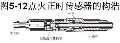 點(diǎn)火正時(shí)傳感器,如圖5-12所示。燃燒室內(nèi)的燃燒光通過石英導(dǎo)入光敏晶體三極管,轉(zhuǎn)換成電信號(hào),ECU則根據(jù)此信號(hào)判定實(shí)際點(diǎn)火的時(shí)刻,并以此修正噴油提前角。