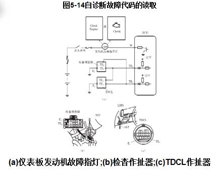 如圖5-14 (a)所示;電控單元檢測插座一般位于發(fā)動機(jī)艙內(nèi)。當(dāng)將檢測插座與檢測端子TE對地短接后(如圖5-14 ( b)所示),發(fā)動機(jī)警告燈會閃爍,閃爍次數(shù)即故障代碼;故障診斷插座通常位于儀表板下方,它是電控系統(tǒng)診斷信號的專用連接器,主要用于與專用車外故障診斷儀(也稱電腦解碼器)相連接,進(jìn)行車外診斷,以擴(kuò)充隨車診斷系統(tǒng)的診斷信息和診斷功能。