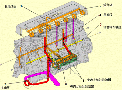 在機(jī)油泵上設(shè)有限壓閥(又稱安全閥),當(dāng)機(jī)油泵輸出壓力較高時(shí),限壓閥打開(kāi),將機(jī)油直接送回油底殼,防止進(jìn)入主油道的機(jī)油壓力過(guò)高。濾清器、冷卻器等處的進(jìn)油孔與出油孔之間設(shè)有旁通閥。當(dāng)上述裝置堵塞造成通過(guò)能力下降時(shí),旁通閥打開(kāi),機(jī)油直接進(jìn)入主油道,以保證主油道的機(jī)油壓力。主油道上設(shè)有溢流閥,當(dāng)主油道壓力過(guò)高時(shí),溢流閥打開(kāi),機(jī)油直接流回油底殼。