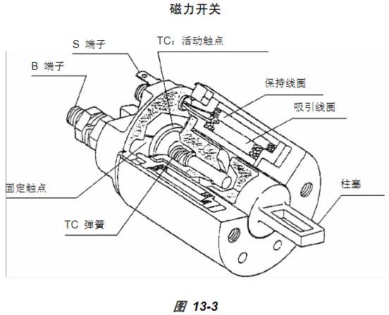 圖 13-3所示為磁力起動馬達(dá)電磁閥。磁力開關(guān)有下列主要功用:•吸引柱塞來推出小齒輪,使其與洋馬發(fā)動機齒圈嚙合。•閉合活動觸點,使蓄電池電流流過電樞。
