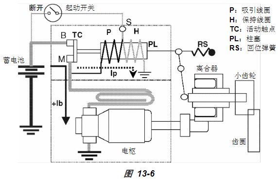 此時,S 端子上的蓄電池電壓 Vb消失。另一方面,蓄電池電壓 Vb會施加到觸點 M 上。因此,電流從觸點 M 經(jīng)吸引線圈 P 流到保持線圈 H,最終流向接地。在(圖 13-6)所示的狀態(tài)下,