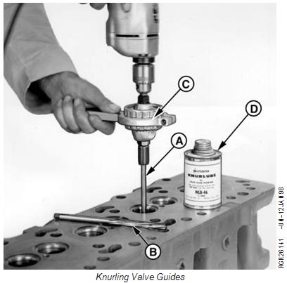 注意:磨損的導(dǎo)軌允許間隙為0.15毫米(0.006英寸),但仍可接受。如果氣門與導(dǎo)軌之間的間隙為0.25 mm(0.010 in.)或更小,磨損的導(dǎo)軌可以滾花,以使其返回到規(guī)定的間隙。如果間隙超過0.25 mm(0.010 in.),則安裝超大閥門。