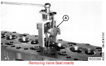 1. Remove valve seat insert (if necessary) with JDE41296 Valve Seat Puller (A). Adjusting screw on puller may need to be retightened during removal of inserts.