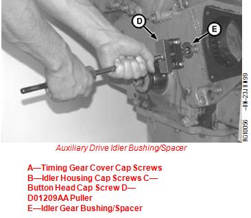 A—Timing Gear Cover Cap Screws B—Idler Housing Cap Screws C—Button Head Cap Screw D—D01209AA Puller