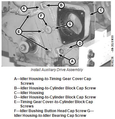 A—Timing Gear Cover-to-Cylinder Block Cap Screw B—Idler Housing-to-Timing Gear Cover Cap Screws C—Idler Housing-to-Cylinder Block Cap Screw