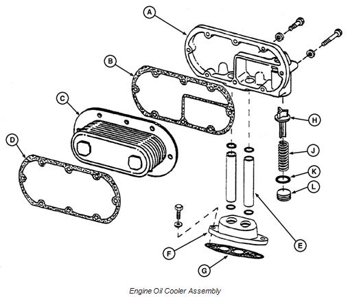 B—Cover-to-Cooler Gasket E—Oil Cooler Tubes (2 used) H—Oil Cooler Bypass Valve L—Plug