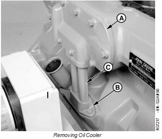 2. Remove two cap screws securing oil cooler tube adapter (B). Remove cover, tubes (C), and adapter as an assembly.