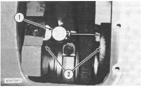 3. 安裝一個(gè)STARRETT NO.696曲軸變形千分表,STARRETT NO.696B平衡附件要位于如圖所示的平衡重之間。將千分表(1)放置在平衡重上表面(2)上方6.4毫米(0.25英寸)范圍內(nèi)。轉(zhuǎn)動(dòng)指示器的度盤使零刻度與指針對(duì)準(zhǔn)。從指示器的末端轉(zhuǎn)動(dòng)指示器直到指示器的指針不會(huì)從零刻度移開(kāi)。