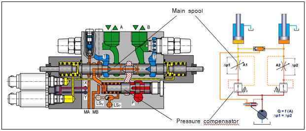 同樣就負(fù)載傳感系統(tǒng)而言,執(zhí)行機(jī)構(gòu)的速度是由控制塊內(nèi)主閥芯的位置決定的。打開的通流面積較大也就意味著速度較高。最基本的差異是用負(fù)載傳感, 流量是可控的。