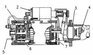 電磁閥(2)在空心氣缸周圍有繞組(一組或兩組)。彈簧加載的柱塞位于氣缸內(nèi)。柱塞可以前后移動(dòng)。當(dāng)啟動(dòng)開關(guān)閉合,電流通過(guò)繞組輸送時(shí),產(chǎn)生磁場(chǎng)(1)。磁場(chǎng)(1)將柱塞在氣缸中向前拉。這會(huì)移動(dòng)換檔桿,使小齒輪驅(qū)動(dòng)齒輪與齒圈接合。然后,柱塞前端通過(guò)電磁閥(2)的蓄電池和馬達(dá)端子進(jìn)行接觸。接下來(lái),起動(dòng)馬達(dá)開始轉(zhuǎn)動(dòng)發(fā)動(dòng)機(jī)的飛輪。當(dāng)起動(dòng)開關(guān)打開時(shí),電流不再流過(guò)繞組。彈簧現(xiàn)在將柱塞推回到原始位置。同時(shí),彈簧使小齒輪遠(yuǎn)離飛輪。