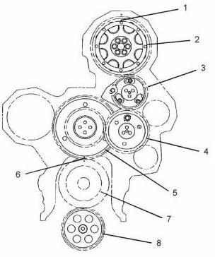 正確噴油正時(shí)和氣門(mén)機(jī)構(gòu)操作的基礎(chǔ)由前齒輪總成正時(shí)的對(duì)準(zhǔn)決定。正時(shí)標(biāo)記(1)到正時(shí)標(biāo)記(6)對(duì)齊,以便在活塞移動(dòng)和氣門(mén)移動(dòng)之間提供正確的關(guān)系。