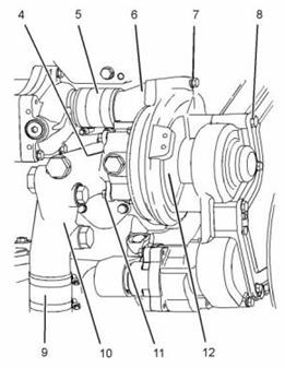 3. 將卡特C13珀金斯2206柴油機(jī)水泵(12)定位到發(fā)動(dòng)機(jī)上并安裝螺栓(8)。將螺栓擰緊至55 N•m(41 lb ft)的扭矩。