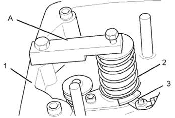 3將工具(A)安裝至搖臂箱(1)。擰緊工具(A)上的螺釘以壓縮噴油器彈簧(2)。壓縮噴油器彈簧,使控制臂(3)能夠自由移動(dòng)。