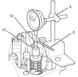 7將工具(E)安裝至氣缸的搖臂箱。特工具(E)的柱塞放置在調(diào)節(jié)器(12)的頂面上。確保工具(E)的刻度盤(pán)設(shè)置為零。