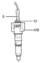 1將噴油器安裝到工具(A)或(B)中。將高壓管(2)連接到供油裝置(9)適配器上。