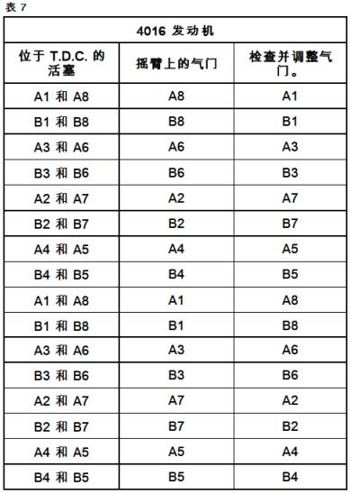 1拆下調(diào)整螺釘(1)。2拆下?lián)u臂室蓋(2)。3拆下接頭(未顯示)。4對其余的搖臂室蓋重復步驟1至3。對于4016•61 TRG發(fā)動機按表7中所示的順序調(diào)整氣門間隙。