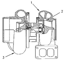 4檢查渦輪機和渦輪機殼體上(1)有無漏油。檢查渦輪機和渦輪機殼體上(1)有無機油結(jié)焦。少許機油結(jié)焦可以清除。大量機油結(jié)焦可能需要更換渦輪增壓器。如果機油來自渦輪增壓器中司殼體請進行步驟4. a。