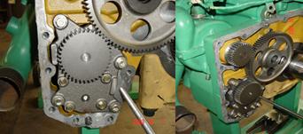 康明斯Cummins QSK23發(fā)動(dòng)機(jī)后齒輪系驅(qū)動(dòng)凸輪軸。 一個(gè)復(fù)合惰齒輪提供所需的速度降。這種布置提供了更小的噪音及更精確的噴油正時(shí)控制。