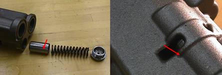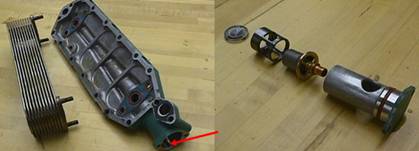 康明斯Cummins QSK23發(fā)動(dòng)機(jī)在每個(gè)機(jī)油濾清器內(nèi)都有一個(gè)旁通閥,設(shè)定開啟壓力為 241 kp (35PSI).濾清器阻力過(guò)大時(shí),旁通閥前后壓差使其克服彈簧力開啟。這使得機(jī)油旁通流過(guò)濾清器,向發(fā)動(dòng)機(jī)提供機(jī)油