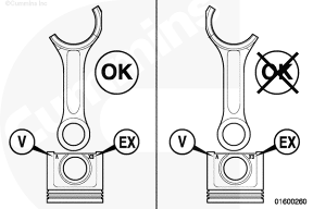 由于氣門套位于活塞頂部,QSK78 鍛造鑄鐵 (FCD) 活塞必須以特定的方向安裝。“EX”標(biāo)記位于連桿柄的長側(cè),而“V”標(biāo)記位于連桿柄的短側(cè)。
